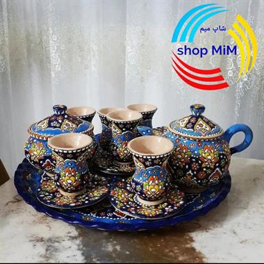 ست کامل چای خوری مینا کاری اعلاء با 6 عدد فنجان کمر باریک، 6 عدد نعلبکی، قوری و سینی 35 سانتی کد 3624